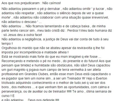 Neiva, esposa do jogador, desabafou nas redes sociais e reclamou, sem citar nomes, de omissão, negligência e descaso: "(Everton está se mostrando mais forte do que eu mesma imaginei que ele fosse. Recomeçando e metendo o pé no medo, do presente e do futuro! Aos que pensam que timidez e humildade são obstáculos, não são. Deus capacitou um guri magrelo que jogava num campo de terra vermelha a ser atleta profissional em grandes clubes. Esse mesmo Deus está capacitando o ex-jogador a ser um treinador", escreveu Neiva.