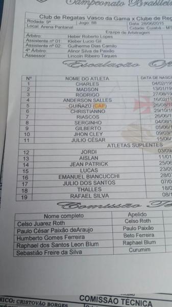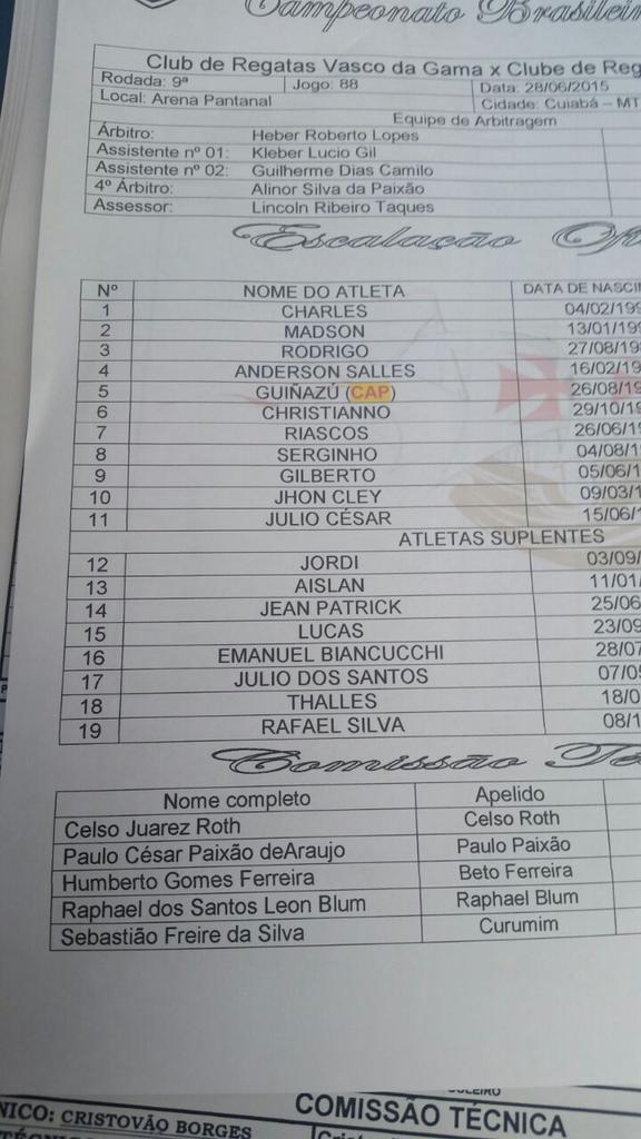 Escalação oficial do Vasco: Charles, Madson, Rodrigo, Salles e Christianno; Guiñazu, Serginho, Júlio César e Jhon Cley; Riascos e Gilberto.