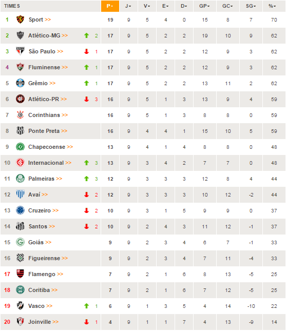Terminada a 9ª rodada do Campeonato Brasileiro, o Vasco, que derrotou o Flamengo por 1 a 0, subiu da 20ª e última para a 19ª e penúltima colocação na competição.
