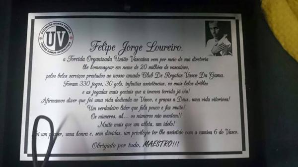 Essa é uma homenagem que estávamos esperando há um tempo para ser feita, a placa foi entregue por Bruno Vecchio, idealizador da homenagem (ex-vice presidente da torcida) e pelo atual diretor de planejamentos da União Vascaína, Amaury (Zinho).