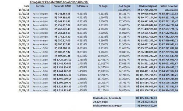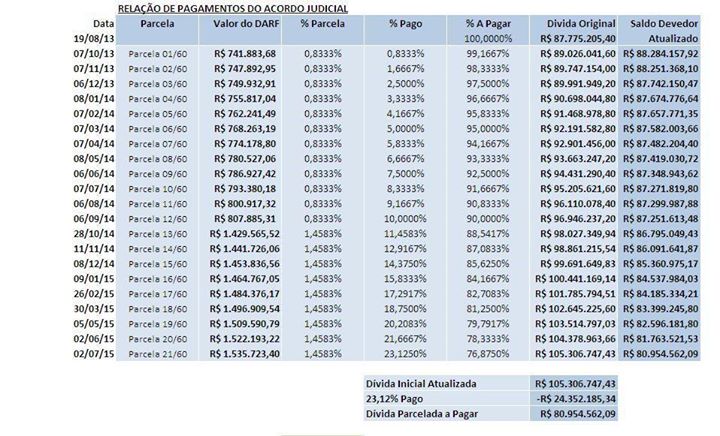 No dia 2 de Julho foi paga pelo clube mais uma parcela do refinanciamento do acordo judicial, a vigésima primeira de um total de 60. O valor dessa parcela está em torno de 1,5 mi, à partir de Outubro passará a ser de aproximadamente 2 mi.