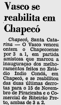 A história só registra um confronto entre Vasco e Chapecoense até hoje. Ele ocorreu em 19 de março de 1978, o Estádio Índio Condá (hoje chamado Arena Condá), em Chapecó (SC), e terminou com a vitória vascaína de virada por 3 a 1. O amistoso serviu como inauguração das melhorias feitas na praça de esportes local. Os gols do Vasco foram marcados por Guina, Zanata e Paulinho. O Gigante da Colina, campeão carioca em 1977, atuou com Mazarópi; Orlando (Fernando), Gaúcho, Geraldo e Marco Antônio (Paulo César); Zé Mário (Paulo Roberto), Zanata, Guina e Wilsinho (Helinho); Ramon (Paulinho) e Roberto Dinamite.