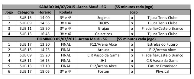 F12/Arena Akxe e Estrelas do Futuro vão duelar às 13h30, de domingo (05), pelo título da categoria. As Estrelas do Futuro foram os líderes do grupo único na primeira fase. O F12/Arena Akxe ficou logo atrás, em segundo lugar. As Estrelas venceram o Foston, por 2 a 0, nas semifinais, enquanto que o F12 venceu o Phisical, por 1 a 0. Foston e Phisical vão disputar o terceiro lugar às 18h05 de domingo (05), na Arena Mauá.