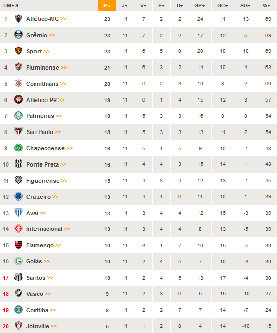 Terminada a 11ª rodada do Campeonato Brasileiro, o Vasco, que perdeu para a Chapecoense por 1 a 0, continuou na 18ª e antepenúltima colocação na competição.