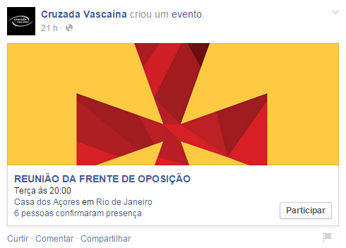 Cruzada Vascaína criou um evento. REUNIÃO DA FRENTE DE OPOSIÇÃO Terça às 20:00 Casa dos Açores em Rio de Janeiro Avenida Melo Matos n° 25 - Tijuca, 20270-290 Rio de Janeiro