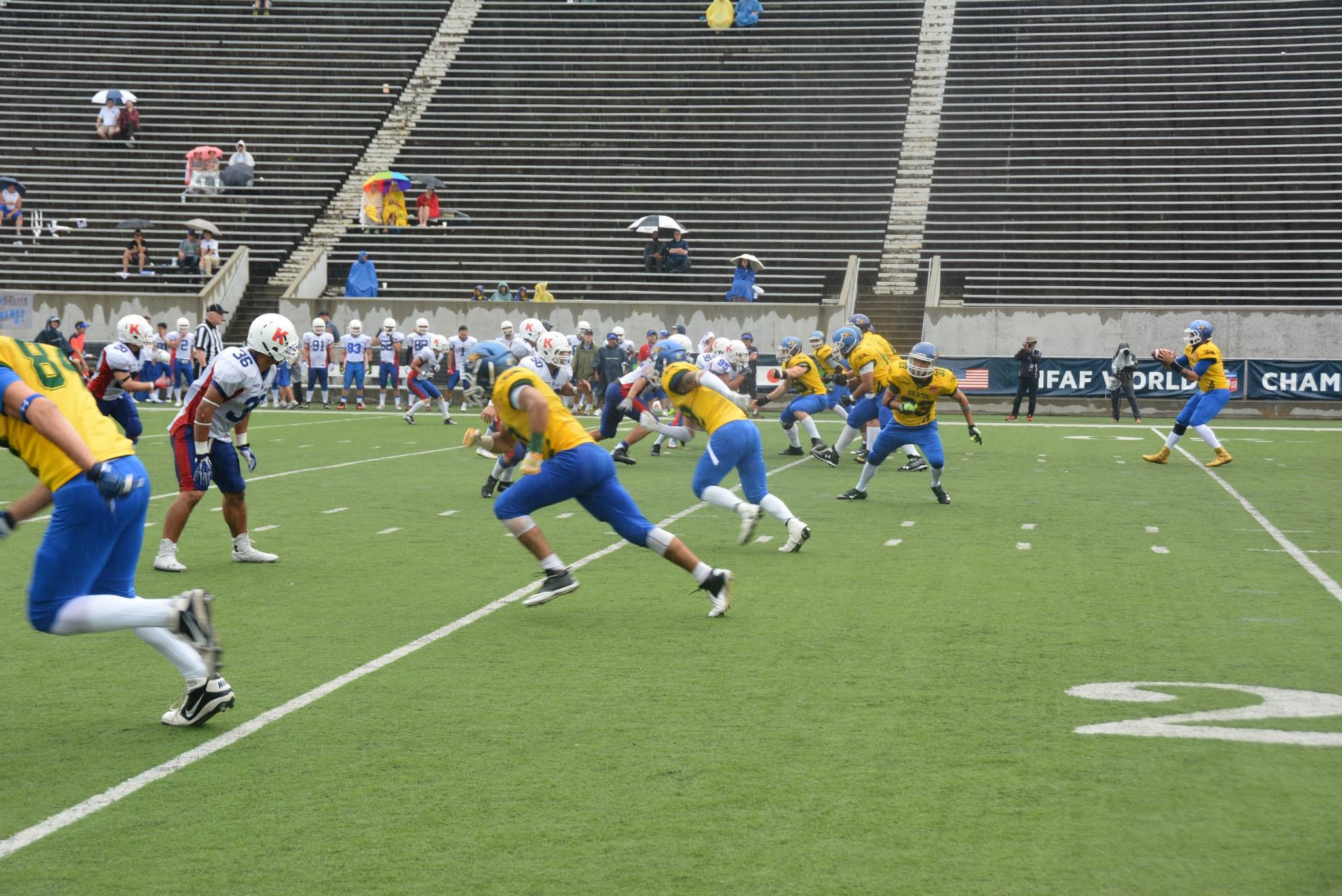 O Brasil venceu sem dificuldades neste domingo, 12/07, a Coreia do Sul na Copa do Mundo de futebol americano nos EUA, por 28x0, com grande atuação dos vascaínos Lipe, widereceiver pegando três passes e do running back, Romulo, correndo 105 jardas, marca excelente em uma partida. Essa foi a primeira vitória da Seleção Brasileira em mundiais.