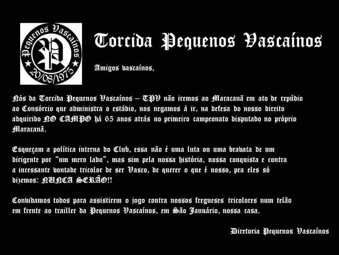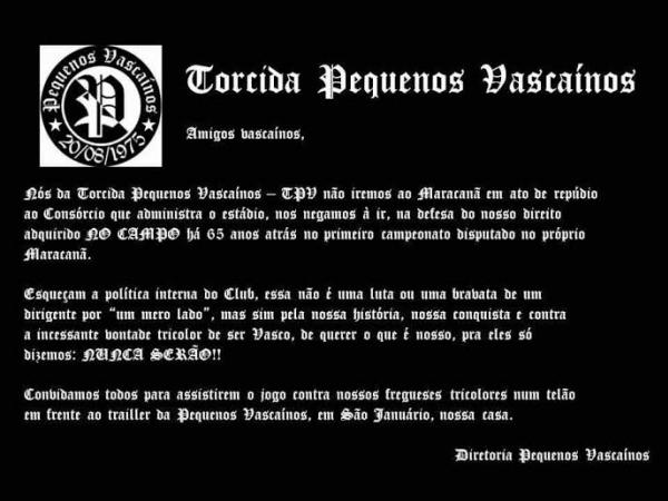 A Torcida Organizada Pequenos Vascaínos emitiu nota nesta terça-feira, dia 13, afirmando que não irá comparecer no jogo Fluminense x Vasco, que será realizado no próximo sábado, no Maracanã. A diretoria da Pequenos Vascaínos tomou a decisão por causa do imbróglio pelo lado direito do estádio.