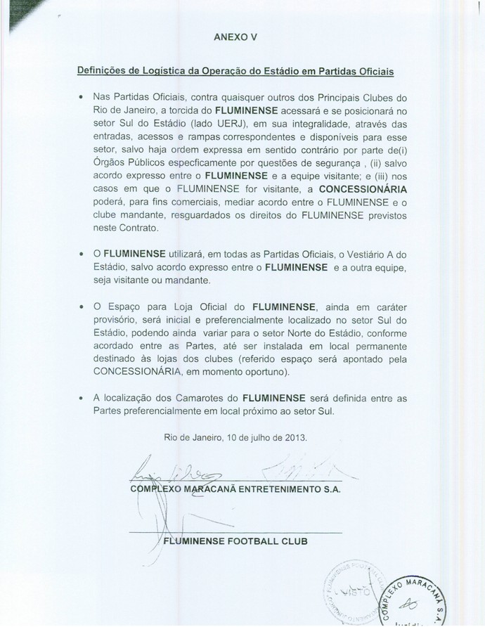 No documento, constam a determinação de que a torcida do Fluminense deve se posicionar no Setor Sul do estádio, a data de 10 de julho de 2013 e as assinaturas que representam o Complexo Maracanã Entretenimento S.A. e o Fluminense Football Club. O presidente tricolor Peter Siemsen afirmou que não havia necessidade de mostrar o aditivo antes e que, para que isso fosse feito, seria necessária uma requisição judicial ou um acordo entre o próprio Fluminense e o consórcio. Na noite de sexta, o clube preferiu não se pronunciar sobre o assunto, tratando-o como sigiloso. Mas neste sábado a diretoria resolveu esclarecer a questão.