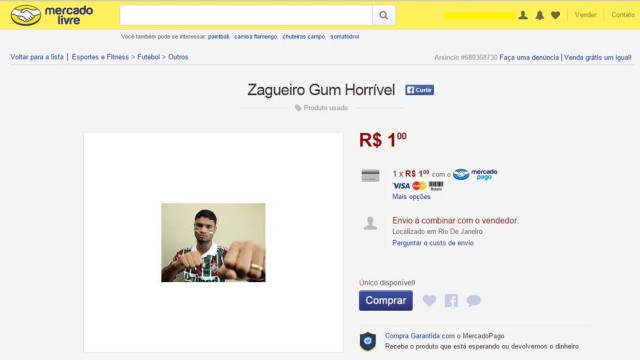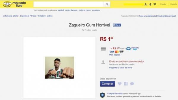 A vitória do Vasco por 2 a 1 sobre o Fluminense, no último domingo, no Maracanã, continua inspirando os torcedores. O zagueiro Gum, que errou o tempo de bola na jogada do primeiro gol do Cruz-maltino, marcado por Andrezinho, é a mais nova vítima das provocações. Ele foi colocado à venda pelo preço de R$ 1 no Mercado Livre, site de vendas da internet. Lá, é descrito como zagueiro "Gum Horrível, um produto usado" e "único disponível" no estoque.