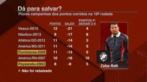 Tomando como exemplos campanhas de equipes que estavam em situação parecida, apenas o Fluminense em 2009, comandado por Cuca, que chegou na mesma rodada com 11 pontos, em último lugar, mesmo assim, conseguiu com uma arrancada a partir da 28ª rodada evitar a queda para a segunda divisão.