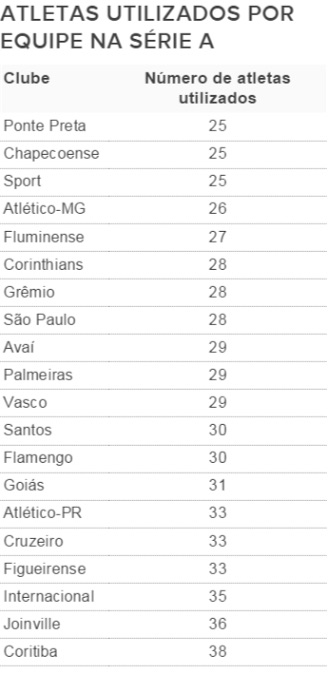 Veja a lista com o número de jogadores utilizados por clube até a 15ª rodada (o Vasco usou Jean Patrick no meio de seman, já pela 16ª rodada, seu trigésimo atleta):