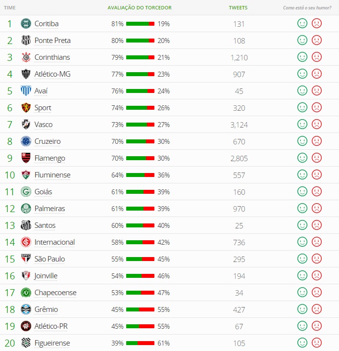 Veja quais são as torcidas mais otimistas e pessimistas no Twitter. Os dados referem-se à análise de sentimento das últimas 3 horas. Participe e compartilhe a sua opinião.