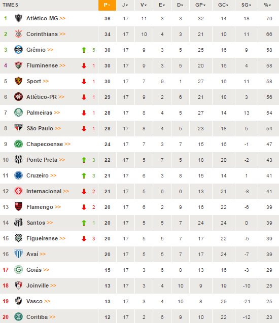 O Gigante da Colina está a 23 pontos do líder (Atlético-MG), a 17 pontos do G4 (Fluminense, 4º colocado) e a 7 pontos do 1º time fora da zona do rebaixamento (Avaí, 16º colocado).