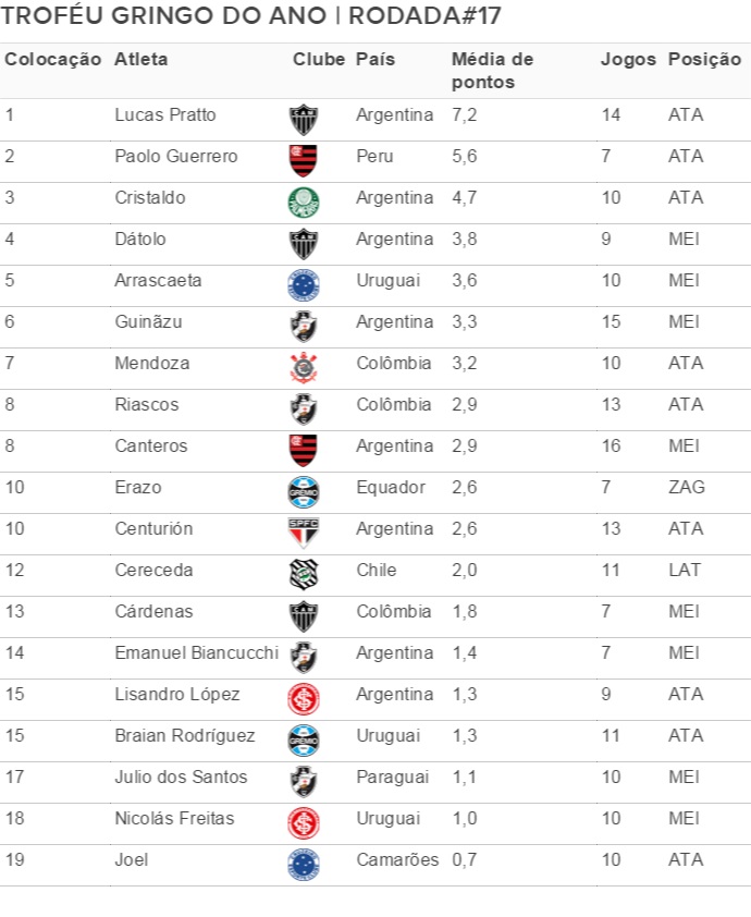Com seu gol-relâmpago contra o Cruzeiro, o argentino Cristaldo melhorou sua média, mas ainda assim foi ultrapassado por Guerrero. A disputa promete ser boa!