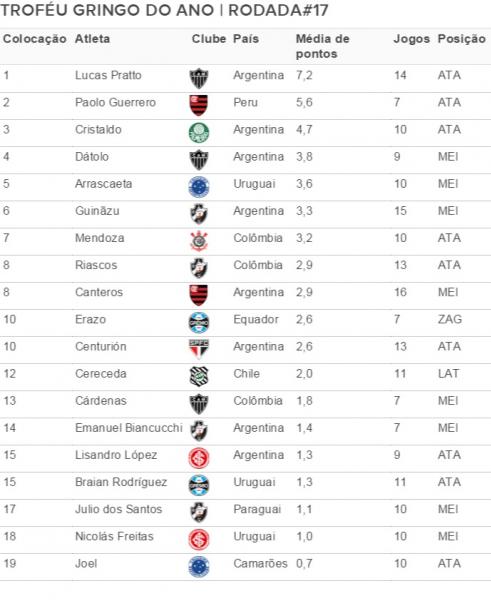 A concorrência para tirar do argentino Lucas Pratto, do Atlético-MG, a liderança do Troféu Gringo do Ano vai ficar mais acirrada. O peruano Paolo Guerrero, do Flamengo, alcançou o mínimo de jogos necessários para fazer parte da premiação e já foi logo ocupando a vice-liderança.