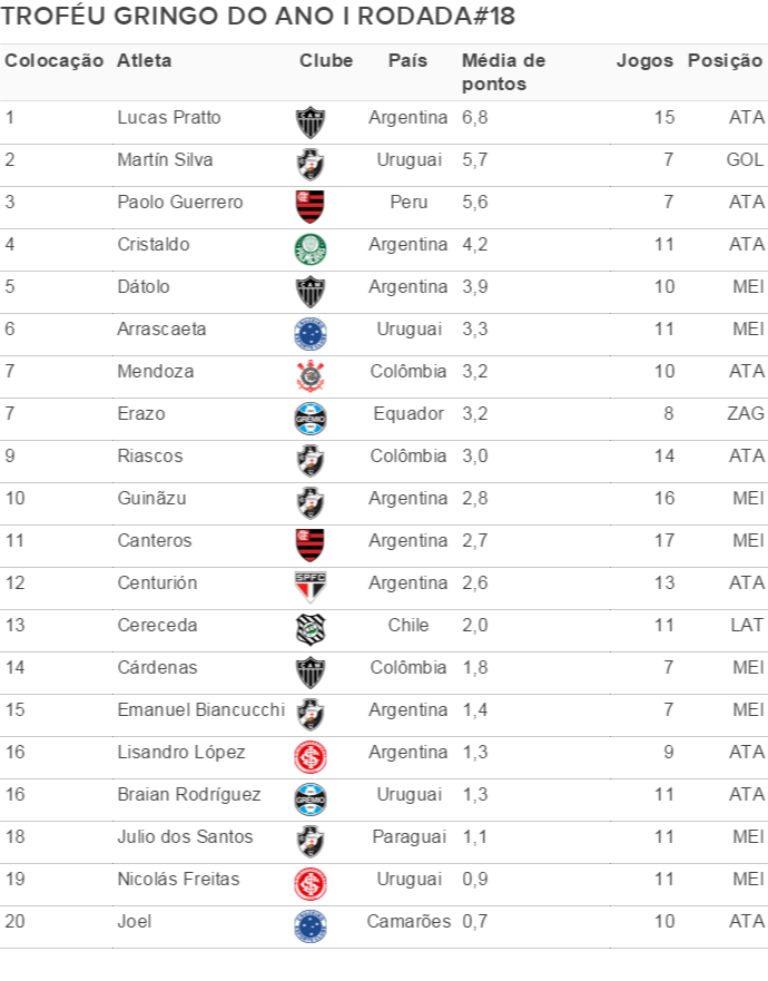 A disputa pela vice-liderança está bastante acirrada, já que vantagem de Martín Silva para o terceiro colocado, o peruano Paolo Guerrero, é de apenas 0,1 ponto. É importante destacar, que o atacante do Flamengo não jogou na rodada #18 por estar suspenso. Com isso sua média continua a mesma da rodada anterior.