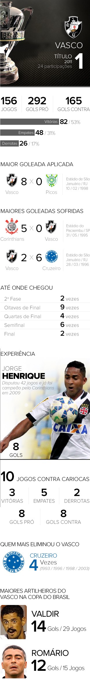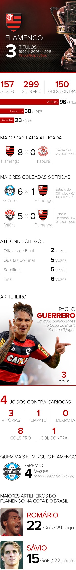 Com 24 participações, o Vasco é o time carioca que mais disputou a Copa do Brasil, levantando a taça apenas em 2011. O Flamengo esteve presente em 19 edições, mas é a equipe do Rio de Janeiro mais vencedora, sendo tricampeã. Embora frequentes na competição, se enfrentaram somente uma vez, na decisão de 2006, vencida pelo Rubro-Negro. Nesta noite, às 22h, no Maracanã, escreverão mais um pouco de suas histórias no torneio, quando começam a decidir uma vaga nas quartas de final.