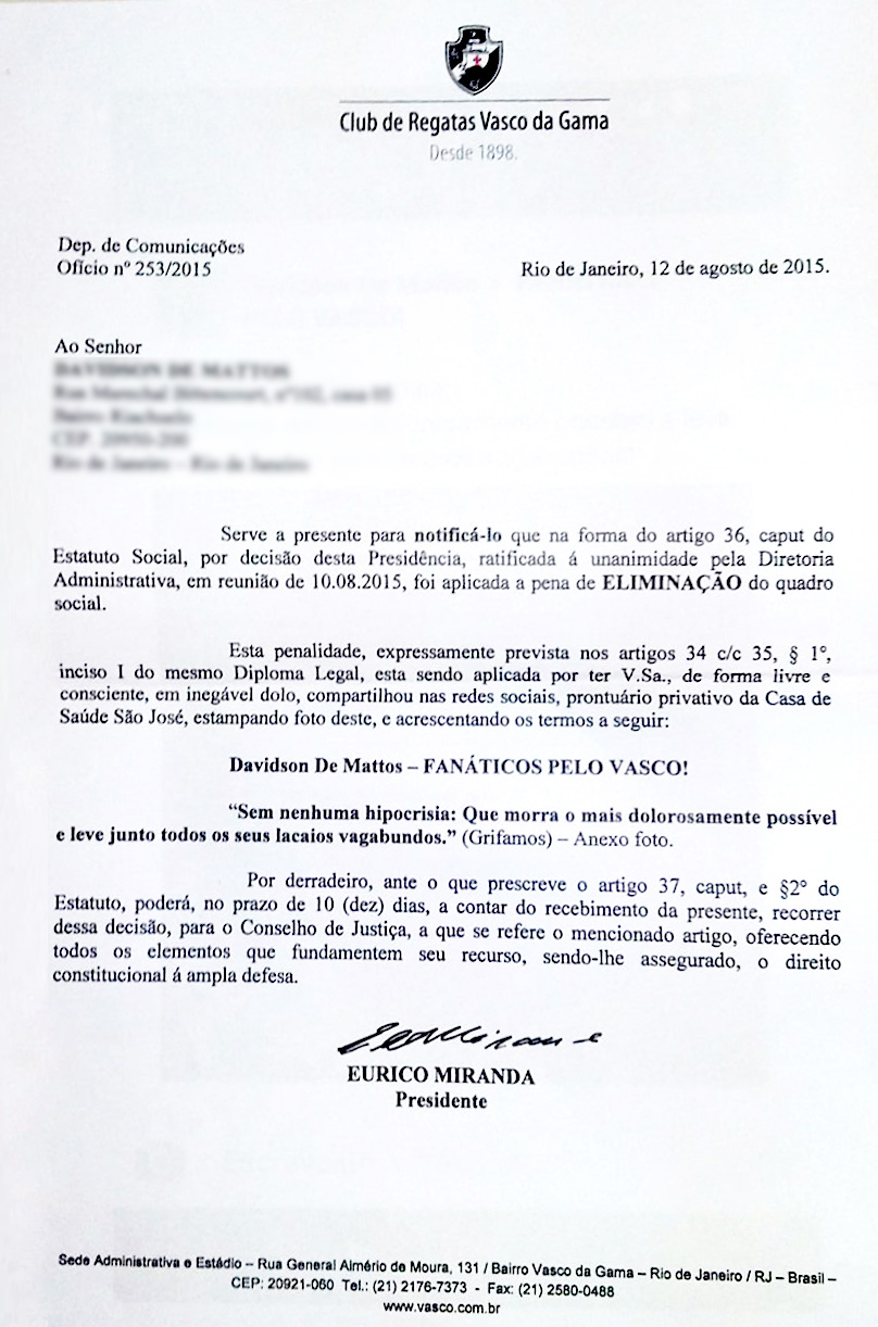Professor e sócio desde 2003, Davidson escreveu em grupo de Facebook que desejava a morte de Eurico, publicando a foto do prontuário médico que vazou de um hospital na Zona Sul do Rio - em exames recentes realizados pelo dirigente. A carta enviada ao professor citava a frase de Mattos - "Sem nenhuma hipocrisia: que morra o mais dolorosamente possível e leve junto toos os seus lacaios vagabundos" - e que a punição imposta ao ex-sócio era "ratificada" por unanimidade pela diretoria administrativa do clube de São Januário. Apoiador de Julio Brant na última eleição, Matos voltou a atacar Eurico e disse que vai lutar na Justiça para voltar ao quadro social.