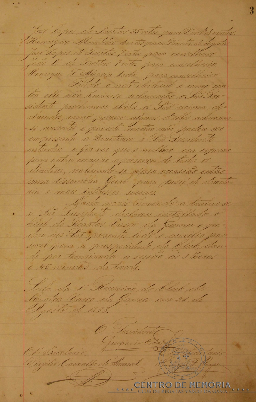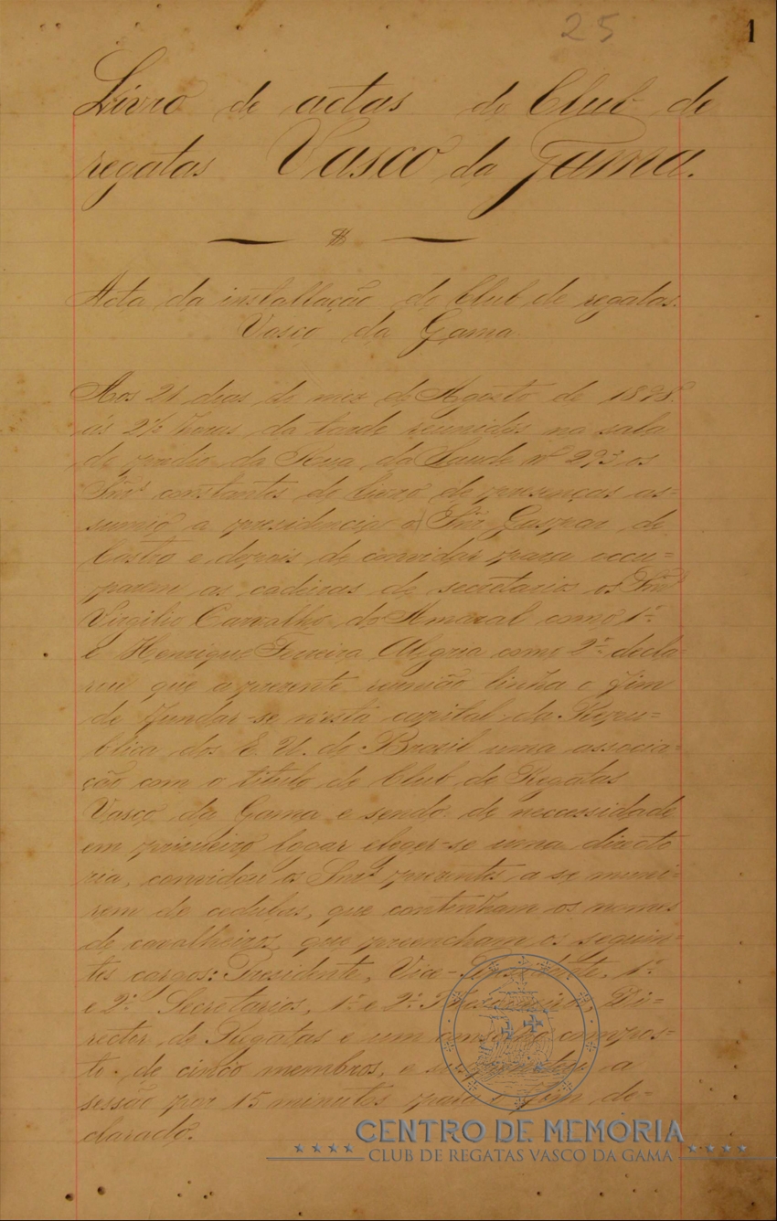 Após algumas reuniões preliminares, em 21 de agosto de 1898, na Rua da Saúde n.º 293 (atual n.º 345 da rua Sacadura Cabral), é fundado o CLUB DE REGATAS VASCO DA GAMA! Nesta primeira reunião, elegeu-se a diretoria e Francisco Gonçalves Couto Junior foi eleito presidente. Todavia, o número total de sócios fundadores não estava presente. Foram 62 os sócios fundadores que estiveram reunidos na Assembeia Geral que fundou o clube, mas, como a própria Ata de Fundação nos diz, entre os próprios eleitos: "alguns d'elles achavam-se ausentes". (Para mais informações a respeito do local de fundação do clube, ver: http://www.memoriavascaina.com/2014/01/rua-da-saude-n-293-o-vasco-nasceu-para.html)
