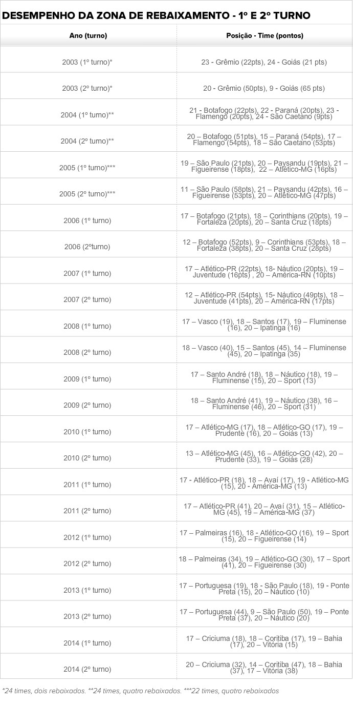Na tabela abaixo, veja como terminaram o campeonato os times que viraram o turno na zona de rebaixamento, desde 2003.