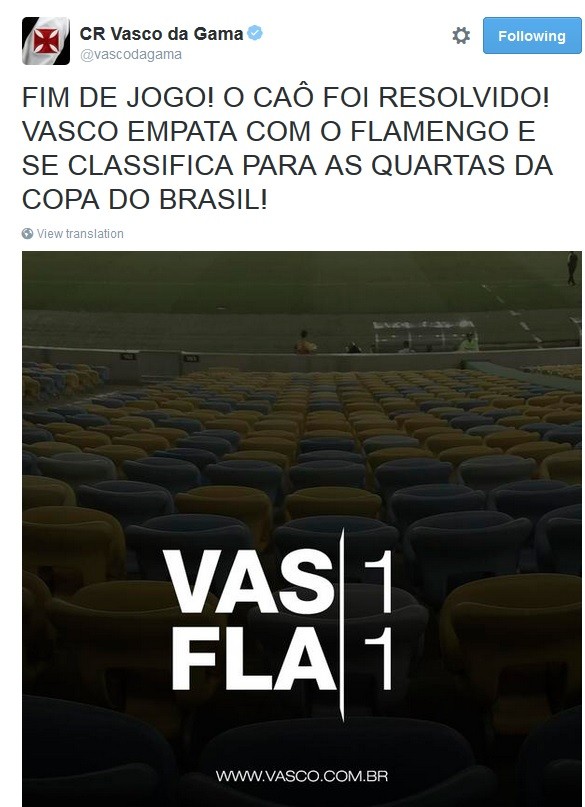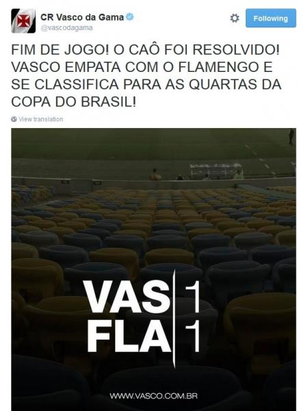 Mal terminou a partida no Maracanã, o Vasco entrou em ação nas redes sociais. Em seu perfil no Twitter, o Cruz-Maltino tirou onda com o rival Flamengo, eliminado da Copa do Brasil nesta noite de quarta-feira após o empate por 1 a 1 no Maracanã. O alvo principal foi o atacante rubro-negro Guerrero. Na última segunda-feira, o centroavante disse que queria "passar por cima do Vasco" e previu que seria 3 a 0 Flamengo.
