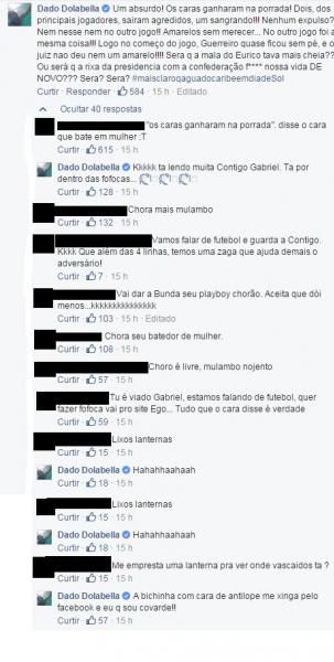 Em post inicial, Dado acusou o Vasco de vencer a partida "na porrada". O ator ficou irritado com a forma como Guerrero e Ederson saíram de campo ainda no primeiro tempo.