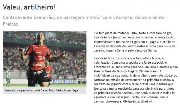 Leandrão faz a trajetória que todo atleta busca, a valorização. Com uma proposta pra lá de especial, o atacante de 32 anos ruma para São Januário e mostra a boa fase do time do técnico Rogério Zimmermann. A visibilidade da sua pontaria de artilheiro promete ajudar os cariocas na missão de permanecer na primeira divisão. O contrato do jogador com o clube previa uma cláusula que isentava a multa rescisória para transferência para times da primeira divisão nacional. Por aqui, a Maior e Mais Fiel agradece a sua passagem, curta, mas intensa, com a camisa rubro-negra. Obrigado, artilheiro!