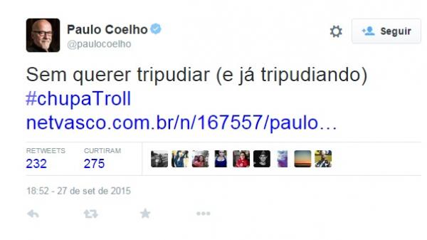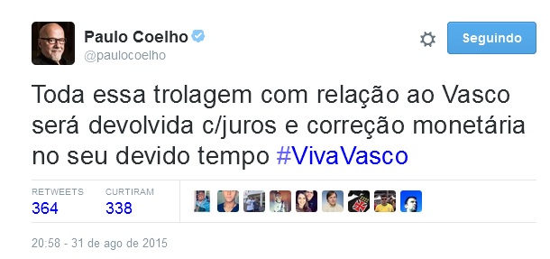 Paulo Coelho @paulocoelho Toda essa trolagem com relação ao Vasco será devolvida c/juros e correção monetária no seu devido tempo #VivaVasco