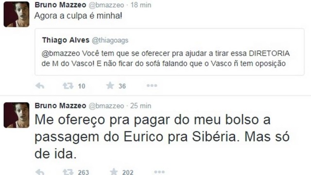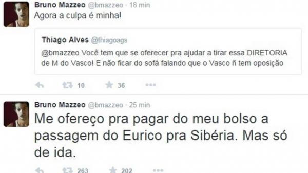 Revoltado com a situação do Vasco no Campeonato Brasileiro, o humorista Bruno Mazzeo, vascaíno declarado, se ofereceu, no Twitter, a pagar a passagem do presidente Eurico Miranda para a Sibéria.