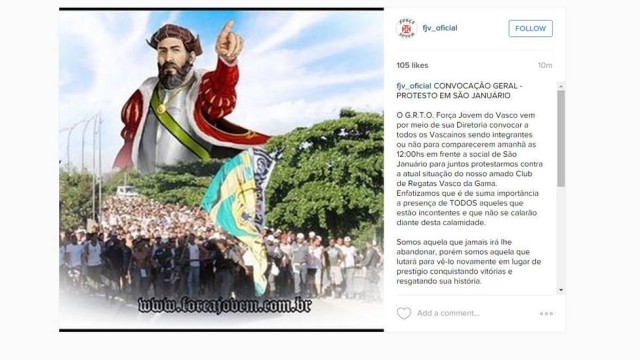 “O G.R.T.O. Força Jovem do Vasco vem por meio de sua Diretoria convocar a todos os Vascaínos sendo integrantes ou não para comparecerem amanhã as 12:00hs em frente a social de São Januário para juntos protestarmos contra a atual situação do nosso amado Club de Regatas Vasco da Gama. Enfatizamos que é de suma importância a presença de TODOS aqueles que estão incontentes e que não se calarão diante desta calamidade. Somos aquela que jamais irá lhe abandonar, porém somos aquela que lutará para vê-lo novamente em lugar de prestígio conquistando vitórias e resgatando sua história.