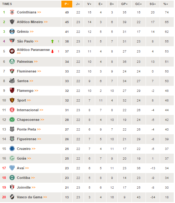 Classificação parcial da 23ª rodada após os jogos de sábado