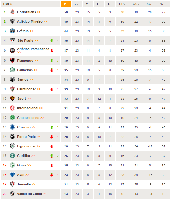 Terminada a 23ª rodada do Campeonato Brasileiro, o Vasco, que perdeu para o Atlético-MG por 2 a 1, continuou na 20ª e última colocação na competição.