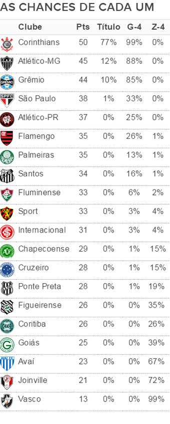 Segundo os cálculos, apenas quatro times têm chances reais de conquistar a taça do Brasileiro. Com o empate em 3 a 3 no clássico com o Palmeiras, na arena alviverde, o Corinthians viu sua porcentagem de chegar ao título diminuir. De 81%, caiu para 77% nesta rodada. Cinco pontos atrás do Timão, o Atlético-MG venceu o Vasco, no Maracanã, e foi de 8% a 12%. Também vitorioso na rodada, o Grêmio tem 10%. O São Paulo mantém 1%.