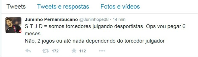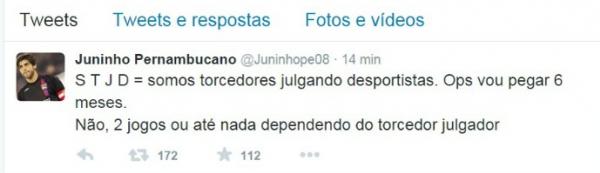 O ex-jogador Juninho Pernambucano, comentarista da TV Globo, postou uma mensagem em seu Twitter criticando o Superior Tribunal de Justiça Desportiva. O comentário veio no dia seguinte ao julgamento de Emerson Sheik, do Flamengo, que xingou o árbitro da partida Flamengo x Vasco, pelas oitavas de final da Copa do Brasil, durante a entrevista na saída para o intervalo da partida. O atacante rubro-negro pegou apenas um jogo de suspensão.