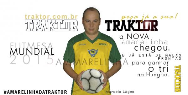 Hoje a TRAKTOR já veste a Seleção Brasileira de FUTMESA que está viajando para a Hungria onde tenta o TRI Campeonato Mundial na Modalidade Bola 12 Toques e as primeiras imagens da nova amarelinha da TRAKTOR chegaram até o torcedor em uma foto com o atleta vascaíno Marcelo Lages que já está na Europa para a disputa do Mundial.