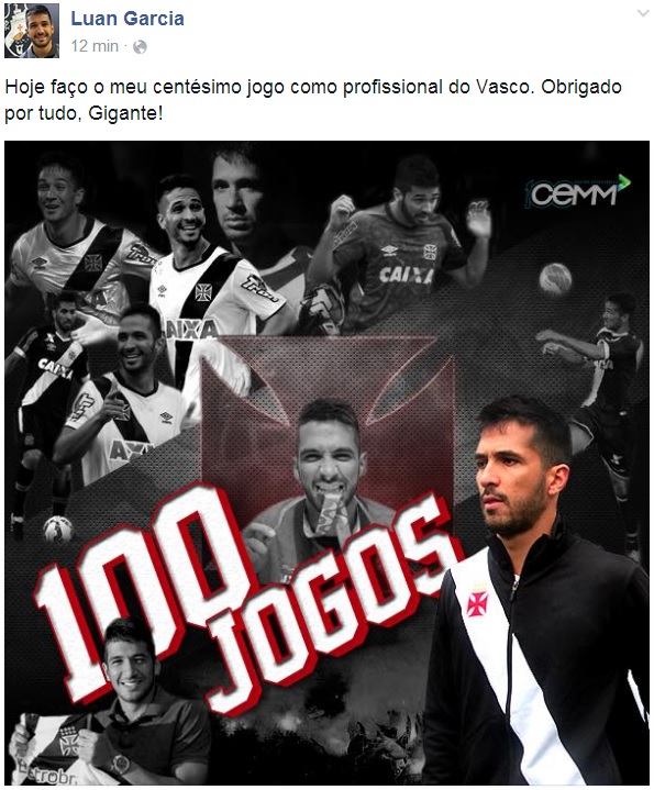 No Facebook, Luan comemora a marca de 100 jogos pelo Vasco