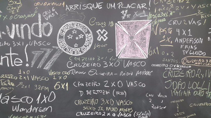 No setor de credenciamento da imprensa há um quadro com palpites do jogo. Jornalistas estão apostando mais no Cruzeiro.