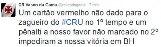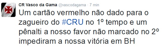 CR Vasco da Gama @vascodagama Um cartão vermelho não dado para o zagueiro do #CRU no 1º tempo e um pênalti a nosso favor não marcado no 2º impediram a nossa vitória em BH