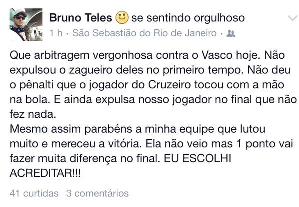FD Assessoria @FDassessoria Lateral @brunoteles_6 elogia entrega do Vasco mas critica abertamente arbitragem do jogo contra o Cruzeiro