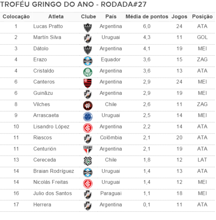 Melhor estrangeiro da rodada#27 com 19,5 pontos, o argentino Jesus Dátolo, do Atlético-MG, subiu uma posição e agora aparece na terceira colocação, com média 4,1 após 19 participações. Segundo com melhor performance desta rodada com 8,5 pontos, o paraguaio Lucas Barrios, do Palmeiras, está com média 6,5, superior à de Pratto, mas também não aparece na lista por ter disputado apenas seis partidas. Para ter chance de levar o troféu, Barrios precisará atuar em todas as partidas do Palmeiras até a rodada 35 (oito jogos consecutivos).