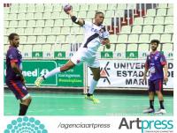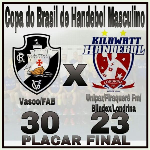 Ninguém segura o Gigante da Colina na Copa Brasil de handebol masculino. Em seu terceiro jogo na competição, último da fase de grupos, o Vasco/FAB derrotou o Unopar/Paiquerê FM/Blindex/Londrina (PR) pelo placar de 30 a 23. Disputada na tarde desta quarta-feira (24/09), no Ginásio Chico Neto, em Maringá (PR), a partida foi bastante movimentada, com duas equipes que vinham invictas no torneio. O resultado positivo garantiu o Cruzmaltino na primeira colocação do grupo B. O camisa 1 Pedro Hermones saiu mais uma vez de quadra com o prêmio de destaque.