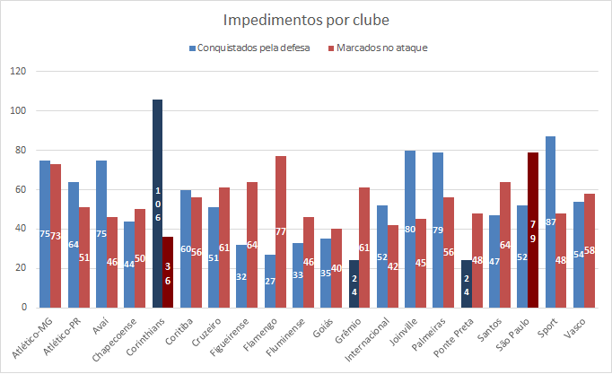 O Corinthians é disparado o time que mais conquista impedimentos (foram marcados 106 de seus adversários, 19 a mais que o segundo colocado, o Sport) e ao mesmo tempo é o ataque menos flagrado nesse tipo de irregularidade: foram marcados 36 impedimentos do ataque corintiano, mas em nove deles os bandeirinhas erraram. Ou seja, os adversários têm anuladas as chances que criam no ataque, e o Corinthians raramente tem seus ataques anulados, um tijolinho a mais para chegar às vitórias que levaram o clube à liderança isolada até aqui.