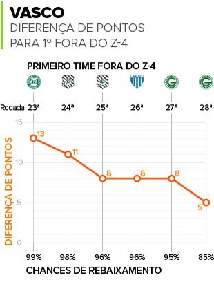 Foram 13 pontos em 15 possíveis. Nem o líder Corinthians, que fez 10, pontuou tanto nos últimos cinco jogos do Campeonato Brasileiro quanto o Vasco, único dos 20 clubes da Série A que também está invicto no período. Visto como virtual rebaixado há seis rodadas, o Cruz-Maltino já começou a encarar a saída da zona de rebaixamento bem mais de perto. A diferença para o primeiro concorrente fora do Z-4, que já foi de 13, caiu para cinco pontos. E até mesmo a matemática vai sendo contrariada pelo time de Jorginho: o risco de cair para a Segunda Divisão chegou a 99% e agora está em 85%, segundo cálculos do matemático Tristão Garcia (compare a evolução dos números no gráfico ao lado). A arrancada, embora tardia - restam 10 partidas para o fim da competição -, permite vislumbrar uma contagem regressiva contra a queda.