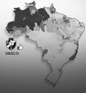 O Vasco é o segundo time em número de torcedores cariocas, mas sua torcida não se limita ao Rio de Janeiro. Isso é o que mostra o Mapa das Curtidas do Brasil. O levantamento feito pelo Facebook em parceria com o GloboEsporte.com indica forte presença cruzmaltina no norte do país e no Espírito Santo. Vila Valério, município capixaba, é a cidade com maior proporção de torcedores do Vasco.