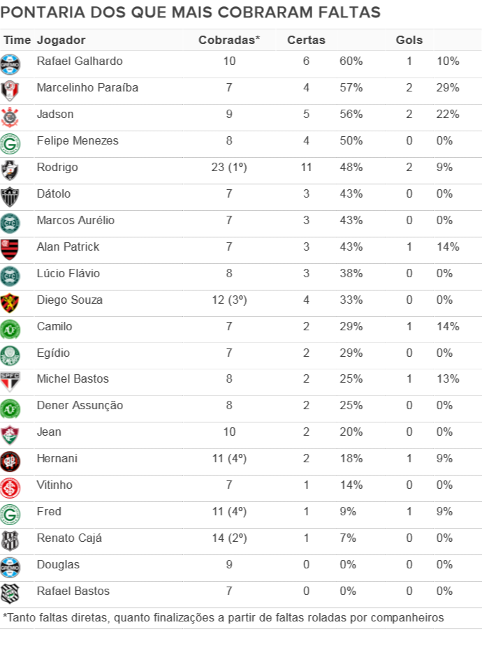 Na lista dos 21 que mais cobraram faltas só não há jogadores de Avaí, Cruzeiro e Santos. Não significa que esses times tenham maus cobradores, apenas não aparecem pela quantidade de cobranças de cada um (esta análise considera um mínimo de sete cobranças). Marinho (Cruzeiro), por exemplo, acertou 100% na direção da meta (apesar de não ter feito gol), mas cobrou meras três. Marquinhos (Avaí) e Lucas Lima (Santos) bateram duas certas - o avaiano até anotou um gol -, mas cobraram só cinco cada.