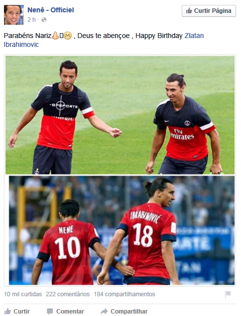 No Facebook, Nenê deseja feliz aniversário ao ex-companheiro Ibrahimovic: 'Parabéns, Nariz'