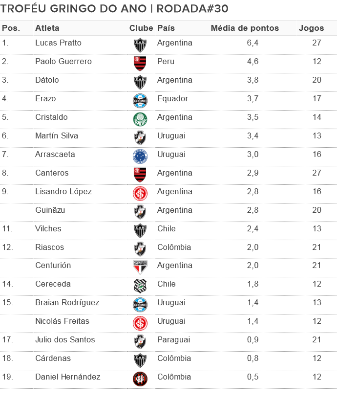 Está difícil tirar Lucas Pratto da liderança do Troféu Gringo do Ano. Sempre que alguém consegue esboçar uma reação, o argentino vai lá e deixa sua marca, dificultando para os adversários. Na rodada #30 foi ainda pior para os rivais, já que além de ninguém da parte de cima da tabela ter incomodado o hermano, ele ainda balançou as redes na vitória do Atlético-MG por 2 a 1 sobre o Internacional. Com o feito, Pratto foi o único dos cinco primeiros a melhorar sua média, indo de 6,3 para 6,4.