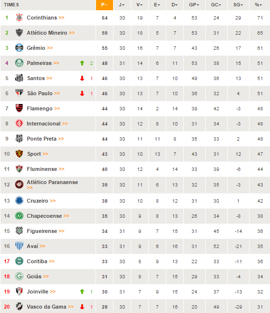 Confira a classificação após os jogos de sábado (Avaí 1 x 3 Palmeiras; Joinville 1 x 0 Figueirense):
