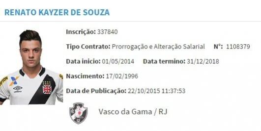 Publicada no registro da CBF hoje a extensão de contrato do atacante Renato Kayzer. Vínculo era até 2017. Agora vai até fim de 2018 #gevas