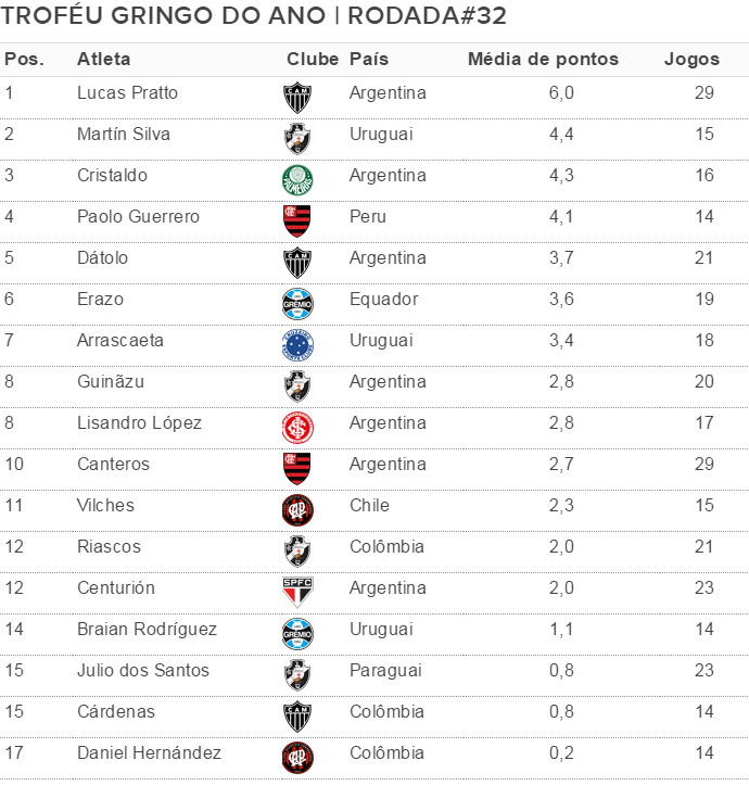 Líder isolado do Troféu Gringo do Ano, o argentino Lucas Pratto não pontuou na rodada#32 do Campeonato Brasileiro, mas segue em primeiro com a boa média de 6 pontos. Já a disputa pela segunda posição está acirrada. Um dos destaques do empate sem gols entre Vasco e Grêmio, o goleiro uruguaio Martín Silva brilhou na meta carioca e fez 22 pts. A grande atuação ajudou o camisa 1 vascaíno a pular de quinto para segundo. Titular contra o Sport, o palmeirense Cristaldo não marcou, porém se manteve na terceira colocação. O peruano Paolo Guerreiro passou em branco na derrota do Flamengo para o Corinthians e despencou da vice-liderança para o quarto lugar. O meia Dátolo, do Atlético-MG, agora é o quinto colocado,